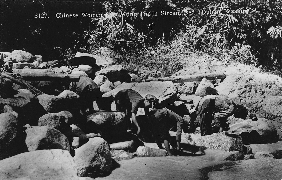 Chinese women streaming for tin in Malaysia are known as Dulang Women. They use shallow wooden bowls.